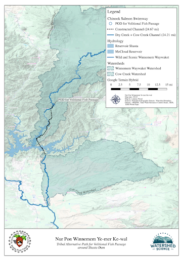In 2025, studies and reports were carried out to evaluate fish passage options around Shasta and Keswick Dams. The Winnemem Wintu only support fish passage that is fully volitional (no human intervention such as truck and haul or fish cannons). Through ceremony, prayer, and traditional ecological knowledge of the watershed, the Nur have shown they will return and use the swimway path of Cow Creek, Little Cow Creek, Dry Creek, and around Shasta reservoir. This year the Winnemem Wintu Tribe worked with engineers and biologists to conceptualize a way to connect the top of Dry Creek to a pathway or constructed river channel that would go around Shasta reservoir and connect to the Winnemem Waywaket.