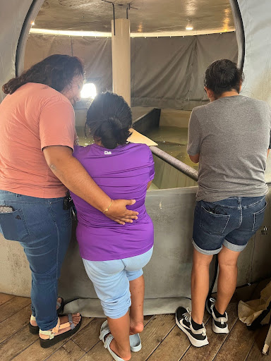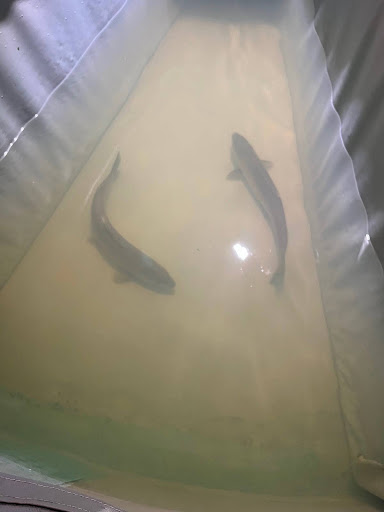 (Left) Marine Sisk, Mya Sisk, and Nina Sisk observe the two McCloud reared Nur. (Right) The two Nur swim in a tank at Livingston Stone National Fish Hatchery. They were not allowed to be transported above Shasta Dam. (Photo by Bekah Olstad)